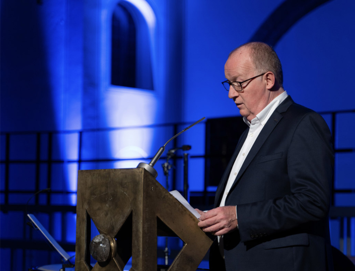 Auf einen feierlichen, nur von Kerzen erhellten Einzug unter den Klängen von „Once in royal Davids city“ folgte weihnachtliche Chorliteratur unterschiedlichster Machart. Die von Schauspieler Ulrich Bärenfänger eindrücklich dargebotenen, alt- und neutestamentarischen Lesungen wechselten sich mit zum Teil gemeinsamen Darbietungen der Chöre und klassischen Advents- und Weihnachtsliedern ab, bei denen das Publikum zum Mitsingen eingeladen war. Während der Konzertchor Münster mit englischen a-capella-Stücken eine eher nachdenkliche und wehmütige Stimmung heraufbeschwor, debütierte der Kinderchor mit Liedern, in denen die Freude über die Geburt des Jesuskindes begeistert in die Welt gerufen wurde. Das Publikum bedachte die überbordende Freude und den Eifer der Nachwuchssänger:innen zwischen 3 und 9 Jahren deshalb auch mit begeistertem „Szenenapplaus“. Mit „For unto us a child is born“, einem lebhaften und jubelnden Stück aus Georg Friedrich Händels Oratorium „Messiah“ erreichte das Konzert einen vorläufigen Höhepunkt. In dem Stück wird die Ankunft des Messias als eine Quelle der Hoffnung und des Glücks für die Menschheit gefeiert.